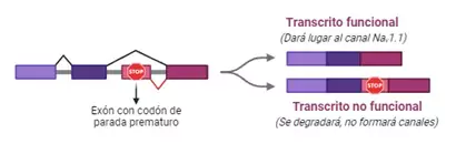 Sin embargo, también de forma natural, las células eucariotas incluyen algunas veces exones que contienen un codón de parada prematuro, haciendo que el transcrito se degrade y, por tanto, no dará lugar al canal NaV1.1. Es lo que se conoce como NMD, por “Nonsense-Mediated Decay”.